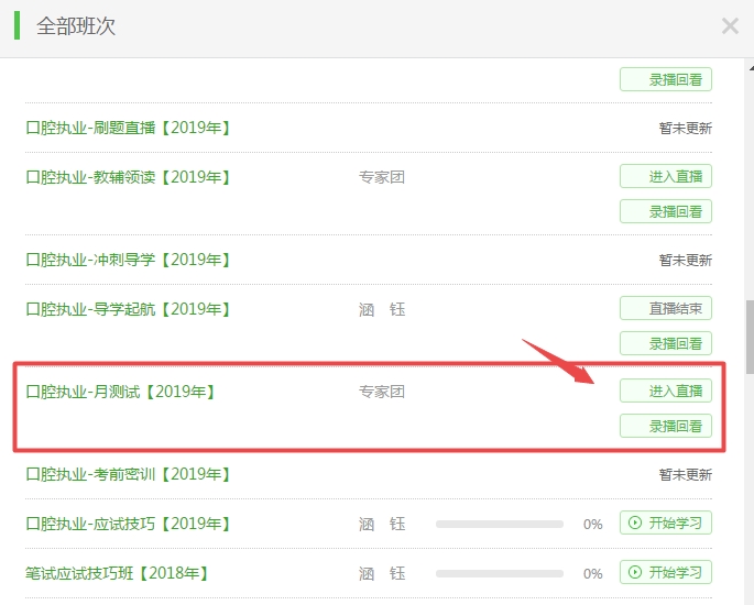 电脑端直播看课:从医学教育网首页进入“我的网校我的家”-“我的课程”-“查看班次”-“月测试”(示例如下)