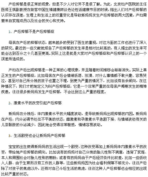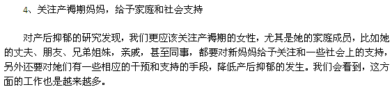 总之,我们不要再像过去那样把计划生育这一国策当成简单的口号式的“一堆夫妇只要一个孩子”,而是针对每个女性在不同的社会条件、不同生理阶段的身体状况的特点,给予她们来自于家庭的、来自于公众的、来自于方方面面的支持,那么可以使这种产后抑郁的情况降到最低。一旦新妈妈出现严重的病症,也要早诊断,早干预,早治疗。