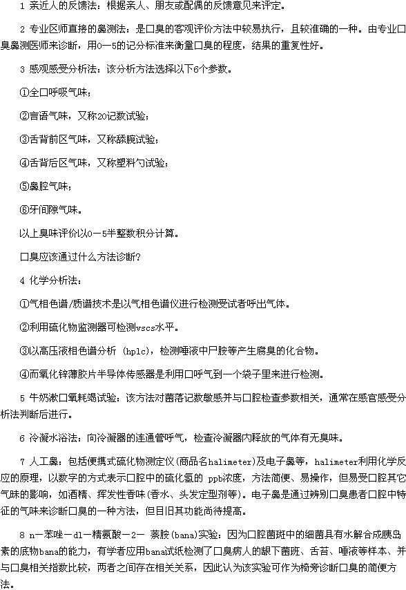 通过怎样的方法可以诊断口臭这种疾病?患有口臭的朋友们一定要重视口臭,因为如果没有及时进行治疗的话,病情会很快发展到更严重的情况,所以为了避免更严重的伤害,一定要早发现早治疗,而且监看的人一定要提前预防。那么通过怎样的方法可以诊断口臭这种疾病呢?下面医学教育网小编就来为大家介绍一下口臭的诊断方法: