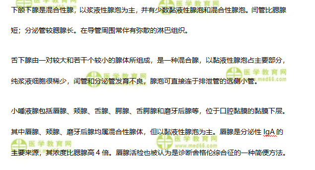 【考点精讲】腮腺全部由浆液性腺泡组成,属纯浆液腺,在新生儿的腮腺中可见少量黏液细胞。闰管长,分泌管多。正常腮腺组织内,经常出现小的淋巴结。5%——10%淋巴结的髓质内出现导管以及腺泡样结构,颈上区淋巴结髓质内亦含有唾液腺组织,医学|教育网此是形成唾液腺良性淋巴上皮病变,腺淋巴瘤以及恶性淋巴瘤的组织学基础。