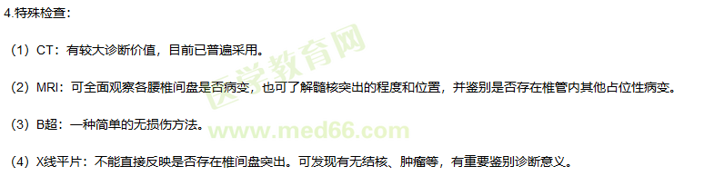 (2)腰椎间盘突出症的体征有:突出水平棘突旁的压痛及放射痛:腰椎侧突及腰活动受限;直腿抬高试验及加强试验阳性;神经系统异常(感觉、运动和腱反射的改变)。