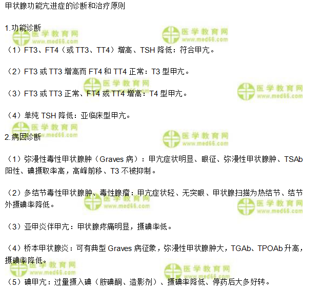 以上为“甲状腺功能亢进症的诊断和治疗原则——《代谢、内分泌系统》考点”全部内容, 由医学教育网小编整理,更多文章请随时关注医学教育网临床执业医师考试栏目!