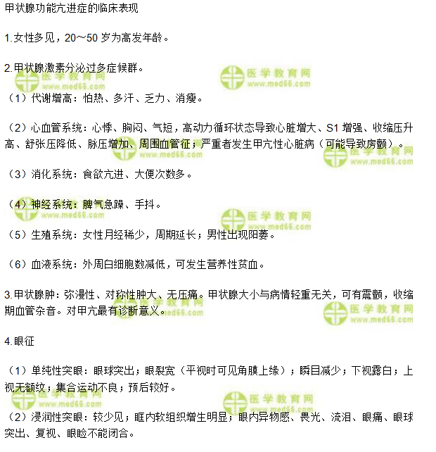 关于“临床执业《代谢、内分泌系统》考点:甲状腺功能亢进症的临床表现”相关内容,相信报考临床执业医师考试的考生都在学习,为提高大家备考效率,在此医学教育 网小编为大家整理如下内容: