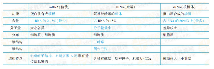 3.rRNA——结构特点(2019调整)有核糖体大、小亚基。功能:参与组成核蛋白体,作为蛋白质合成的场所。各种RNA结构和功能特点总结如下(2019调整):
