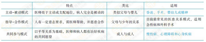 4.医患关系模式是用来描述医患之间的技术关系和非技术关系的,也是对医患关系不同情况的概括和总结的标准式样。依据在医疗措施的决定和执行中医生和患者各自主动性的大小分为主动-被动模式、指导-合作模式和共同参与模式。