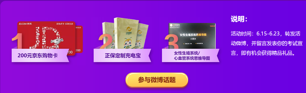 医学教育网6月钜惠活动,火热进行中,6月15日——6月23日活动期间转发活动微博,并留言发表你的考试宣言,即有机会获得精品礼品。