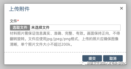文件应使用jpg/jpeg/png格式,上传的照片应确保图像清晰,单个照片文件大小不超过200k。