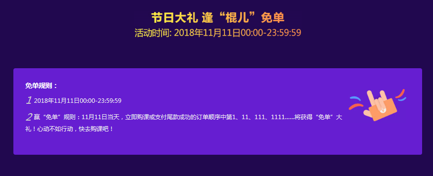 11月11日当天,立即购课订单顺序中第1、11、111、1111……将获得“免单”大礼!