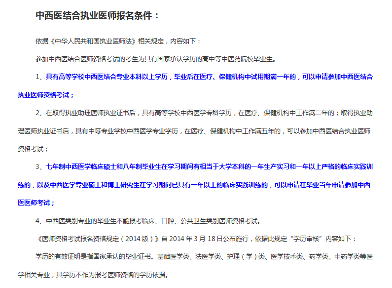 3.2014年12月31日以前入学的中西医结合医学专业的学术学位(原“科学学位”)研究生,具有相当于大学本科1年的临床毕业实习和1年以上的临床实践的,该研究生学历和学科作为报考中西医类别医师资格的依据。在研究生毕业当年报考者,须在当年8月31日前提交研究生毕业证书,方可参加医学综合笔试。