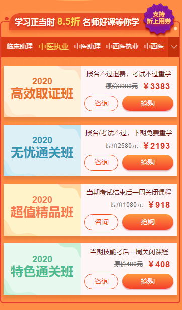 2019年中医执业医师成绩公布,也就是说2019年中医执业医师考试告一段落,2020年中医执业医师考试备考正式开启!同样,医学教育网为大家送来2020年中医执业助理医师的优惠课程,请查收!