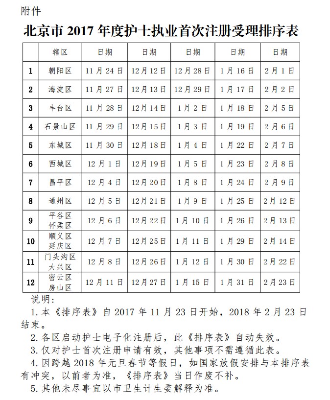 为稳妥做好2017年度护士执业首次注册工作,避免机构扎堆办理,减少机构等候时间,我委根据各区行政区划内机构数量制定了《北京市2017年度护士执业首次注册受理排序表》(以下简称《排序表》),请各机构在本机构所在区受理日当天前来办理。非受理日前来办理原则上不予受理。