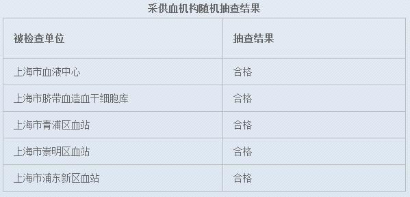 本次随机抽查的采供血机构共5家,分别是:上海市血液中心、上海市脐带血造血干细胞库、上海市青浦区血站、上海市崇明区血站、上海市浦东新区血站。