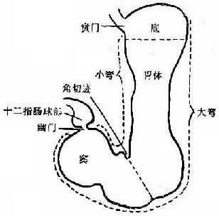 胃分胃底、胃体、胃窦三部分及胃小弯和胃大弯。如图: