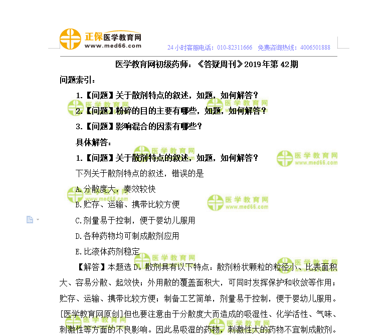 1.【问题】关于散剂特点的叙述,如题,如何解答?