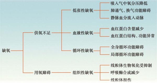 | 原因和机制 | ①全身性的(心力衰竭、休克) ②局部性的(血管病变或阻塞) | ①组织中毒(如氰化物中毒)、②细胞损伤(如放射线、细菌毒素等造成线粒体损伤) ③呼吸酶合成障碍等导致氧利用障碍 |
