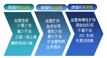 (1)微循环改变:灌而少流,灌大于流,组织呈淤血性缺氧状态