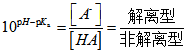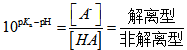 从公式可见,体液pH算数级的变化,会导致解离与不解离药物浓度差的指数级的变化,所以,pH值微小的变动将显著影响药物的解离和转运。