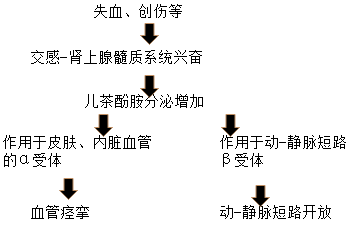 (1)微循环改变:使儿茶酚胺增加,作用于α受体,使皮肤、内脏血管痉挛。作用于β受体,使A-V短路开放;微循环处于严重的缺血、缺氧状态。