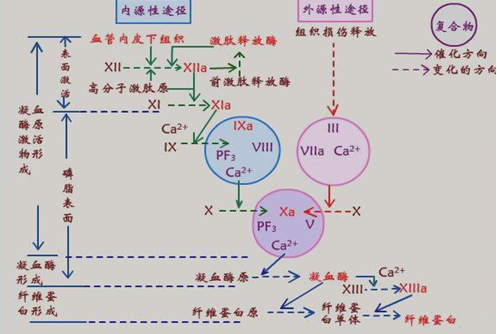 1.内源性凝血:异物(胶原、胎毛及胎粪)激活启动因子(因子Ⅻ)。所有因子都在血液中。