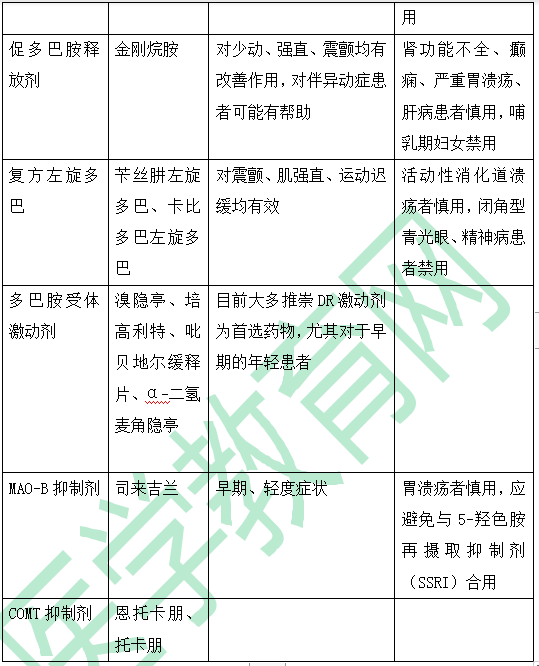 (2)几乎所有病例一旦开始药物治疗均需终身服药,以便控制症状。复方左旋多巴仍是目前治疗帕金森病的“金标准”药物。