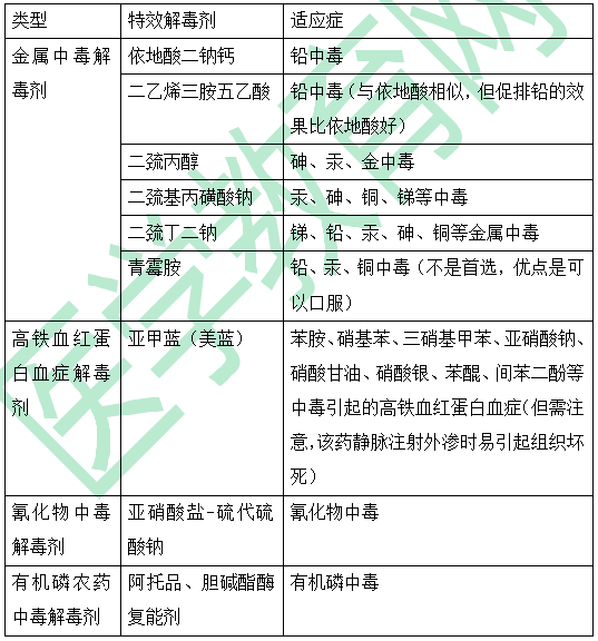 ③要熟知其适应证及禁忌证:如阿托品禁用于五氯酚钠中毒;解磷定忌用于氨基甲酸酯类农药;新斯的明和毒扁豆碱不宜用于有机磷中毒治疗过程中所发生的阿托品过量中毒;镁中毒可用钙剂拮抗,但钙中毒用镁盐却无效。