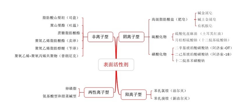 表面活性剂在液体制剂是一种比较重要的辅料,常用作乳化剂、增溶剂、防腐剂等,所以是一个比较重要的知识点。但是由于大家在平时的工作生活中很少会涉及或者接触到这部分知识,因此学习起来会觉得有困难,不知道如何下手。首先,对于这部分内容,一定要先从整体上看需要大家掌握什么,表面活性剂这里要求大家掌握的是分类、应用和生物学性质三方面。其次,对于每一个知识点在学习的时候可以把相关的内容总结成图表的方式,方便大家结合起来对比记忆。比如对于表面活性剂的分类可以总结如下图:
