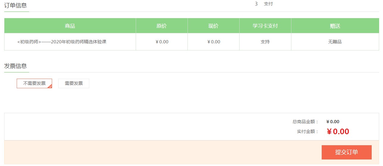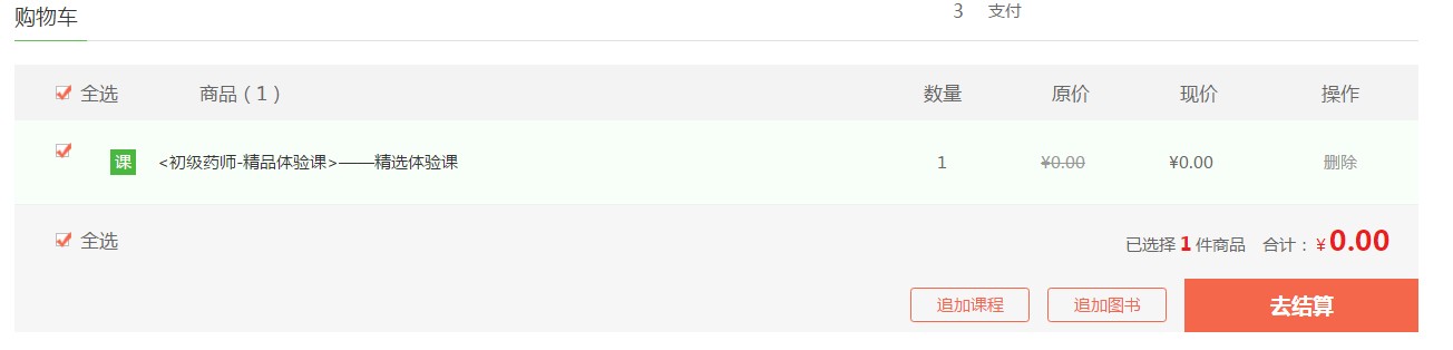第一步:点击上文的“领取课程”进入购物车,点击去结算;
