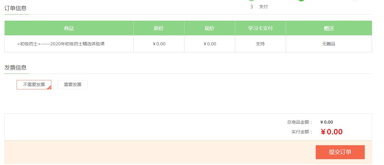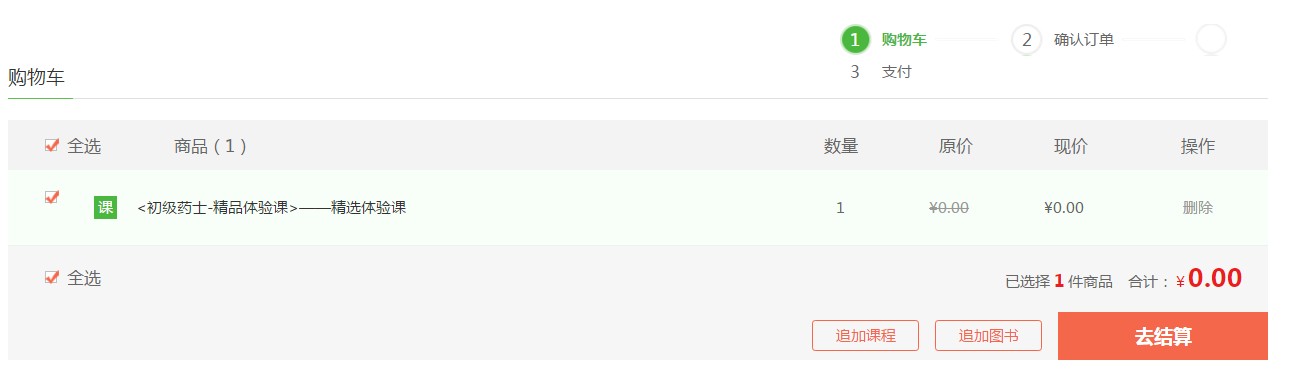 第一步:点击上文的““领取课程”进入购物车,并点击去结算;