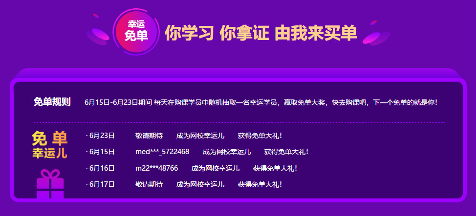 活动期间每天在购课学员中随机抽取一名幸运学员赢取免单大奖,下一个免单的就是你!