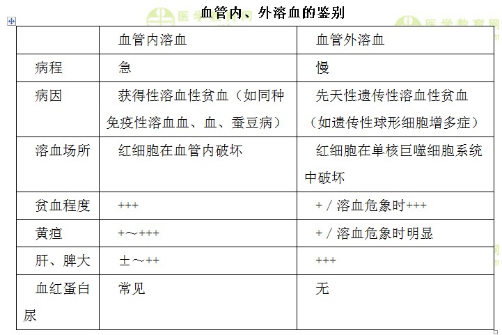 除上述临床表现外,还要注意血管内、外溶血临床表现有不同的特点(表)。