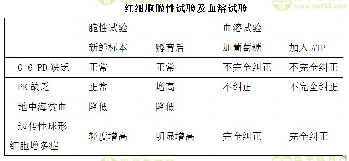 (3)红细胞脆性试验、血溶试验:各病试验结果见表。