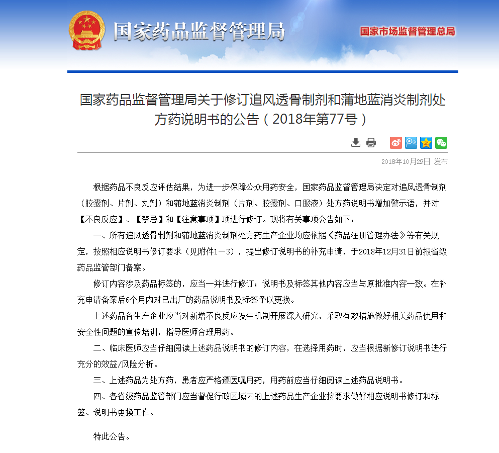 国家药监局发布《关于修订追风透骨制剂和蒲地蓝消炎制剂处方药说明书的公告》已经明确要求蒲地蓝消炎制剂修改说明书,并对不良反应、禁忌、注意事项等项增加说明。