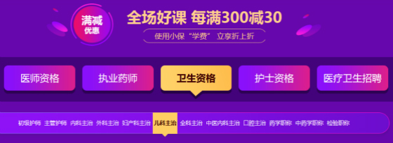 儿科主治课程:无忧直达班、超值精品班均参与每满300减30活动,可与小保学费叠加使用,优惠优惠再优惠!