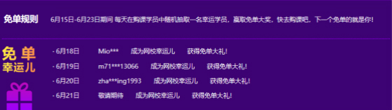 活动期间每天在购课学员中随机抽取一名幸运学员赢取免单大奖,心动就快来吧~