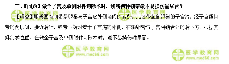 三、【问题】做全子宫及单侧附件切除术时,切断何种韧带最不易损伤输尿管?