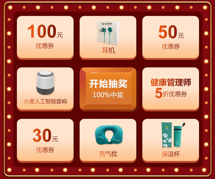 活动期间(11月5日00:00-11月11日23:59),每人每天可抽奖一次,可赢100元优惠券,可与课程折扣叠加使用,更有精美实物礼品等你领。
