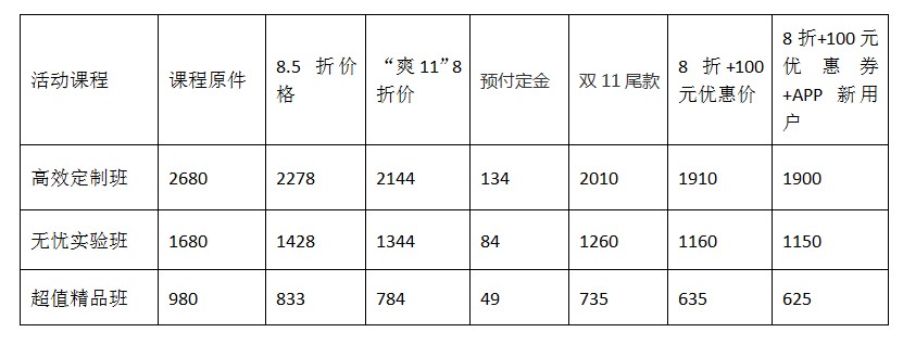 11月5日00:00-11月10日23:59期间,预付定金享8折优惠,抽奖所得优惠券和课程折扣同享!超多100元优惠券等着你!