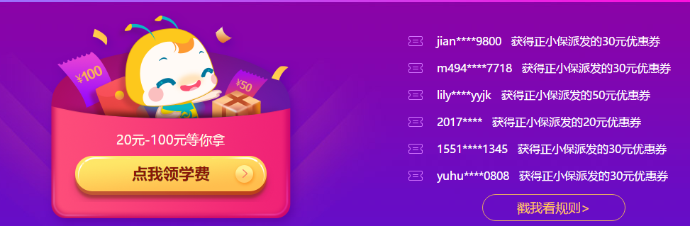 小保给你送“学费”啦!只要注册登录即就可领取面额20元到100元不等的学费,每人限领一次。快来看看你的手气如何!领取的学费可以跟满减折扣活动同享哦!