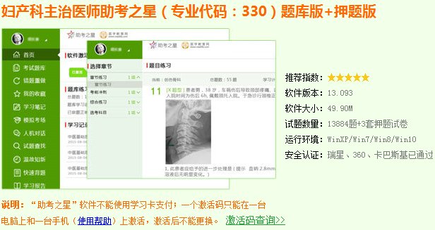 《妇产科主治医师助考之星(专业代码:330)题库版+模拟题版》,囊括了目前所有的主治医师妇产科考试科目:基础知识、相关专业知识、专业知识、专业实践能力。其中“题库版”系卫生专业技术资格考试题辅导软件,适用于主治医师妇产科考试,软件试题库设计紧扣主治医师妇产科考试大纲、考试教材,符合主治医师妇产科考试考试题型与考试科目,复习辅导资料、考试资料丰富,免费试用、试题库大,辅导软件收录主治医师妇产科考试习题集、考前冲刺、历年,并提供专业级的主治医师妇产科考试解题方法、答题技巧、考试要点精解。通过全面、针对性强的强化考试辅导训练、考前培训,提高您主治医师妇产科考试的应试能力,辅导您考试成功。