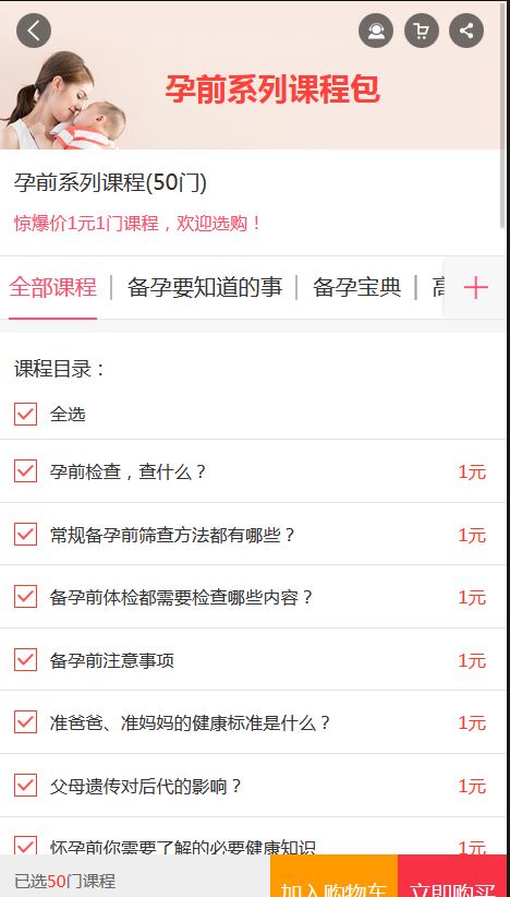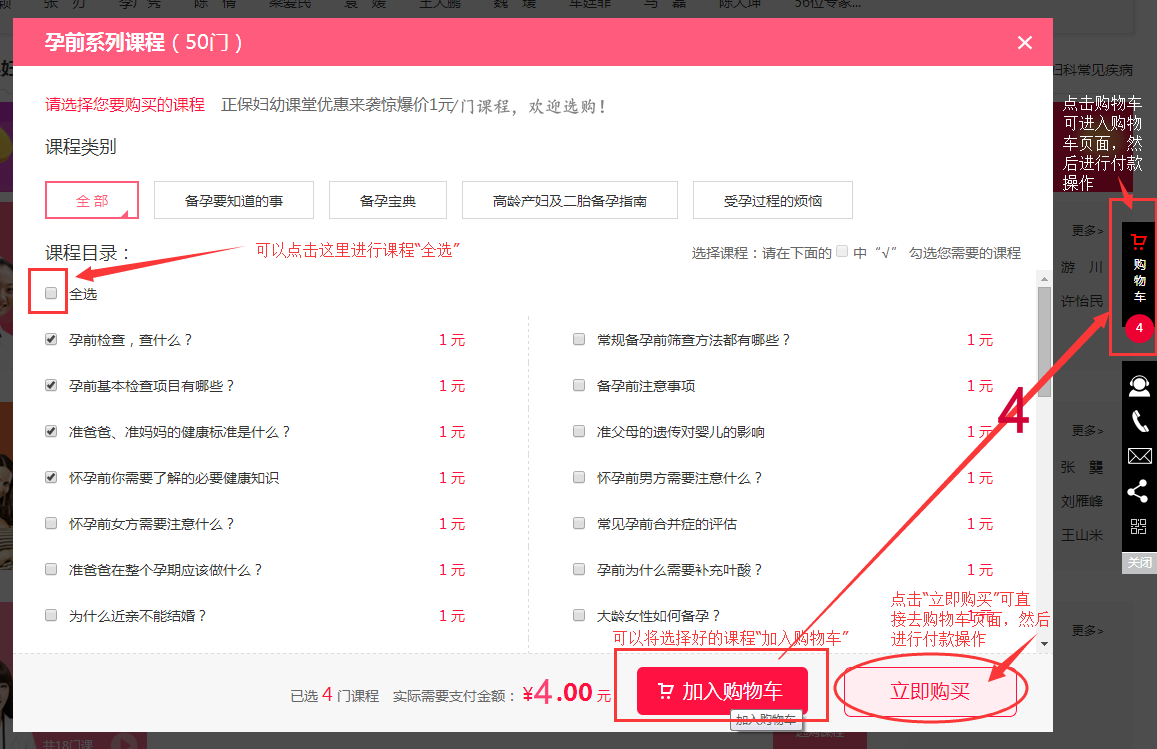 方案/导购页:进入 正保妇幼课程招生方案 或 正保妇幼课程视频导购 页面 ,在如下位置点击“选购课程”跳出图下的弹框,可以点击全选页可以选择单门课程,点击“立即购买”选择支付方式提交订单。