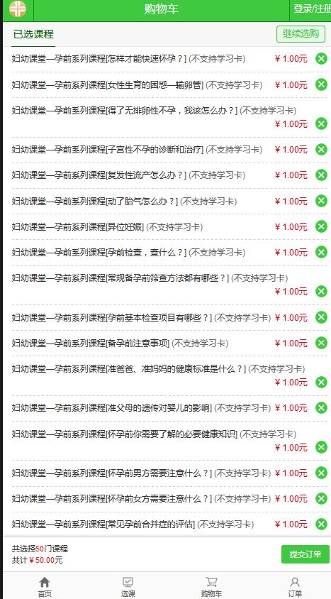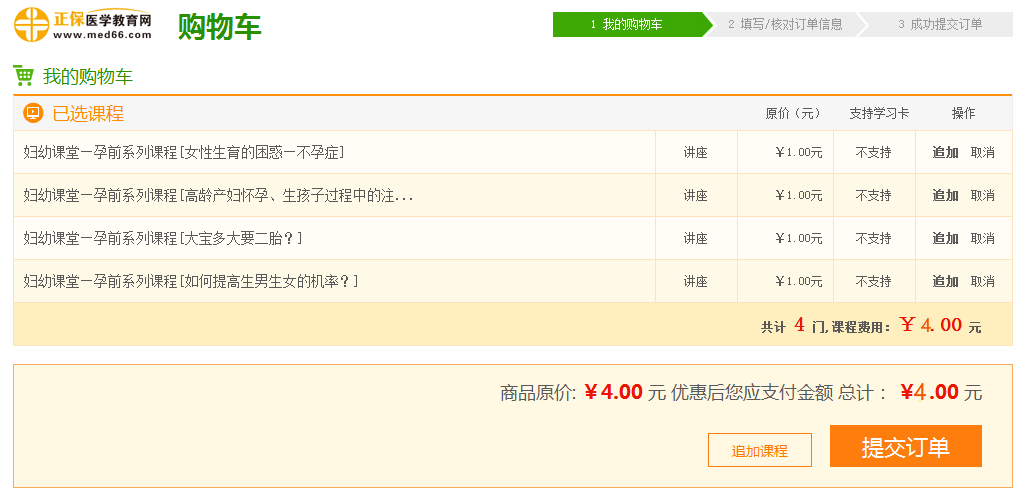 选课成功后,核对购买的课程是否正确,如果想继续购买的话,可以点击课程后面的“追加课程”,确认课程内容及数量无误后,点击“提交订单”按钮,即可进入支付页面了。