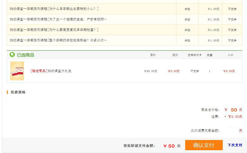 3.进入支付页面,请先将收货人信息填写完整,点击“保存收货人信息”选择任意一个适合自己的发货方式(此处用于赠送商品妇幼大礼包的邮寄注:购课满129元赠送商品妇幼大礼包),点击“保存发货方式”,所有内容确定无误后,点击“确定支付”进入支付方式选择页面。