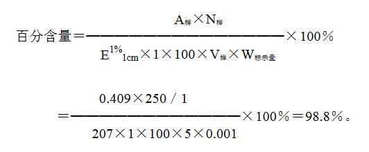 具体操作:精密量取本品5ml,置250ml量瓶中,加水至刻度,摇匀,以水为空白,在361nm波长处测定吸收度为0.409.