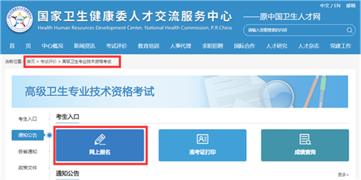 1.登录国家卫生健康委人才交流服务中心官方网站(,原中国卫生人才网),进入高级卫生专业技术资格考试专区,点击“网上报名”。