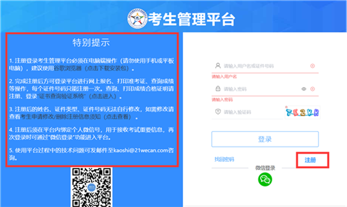 (1)务必由考生本人进行注册操作,确保信息真实有效。点击“注册”后信息将无法自行修改,请认真核对填写内容。