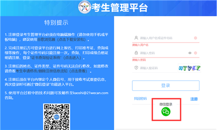 4.注册成功后系统会返回登录页面,输入注册的用户名、密码以及验证码,登录考生管理平台。