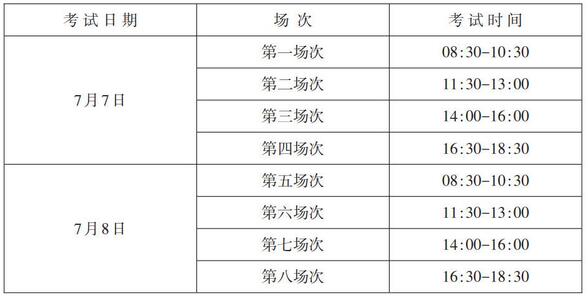 2018年7月7-8日两天考试,分8个场次考完,考试时间每批次120分钟;考试场次及时间安排如下: