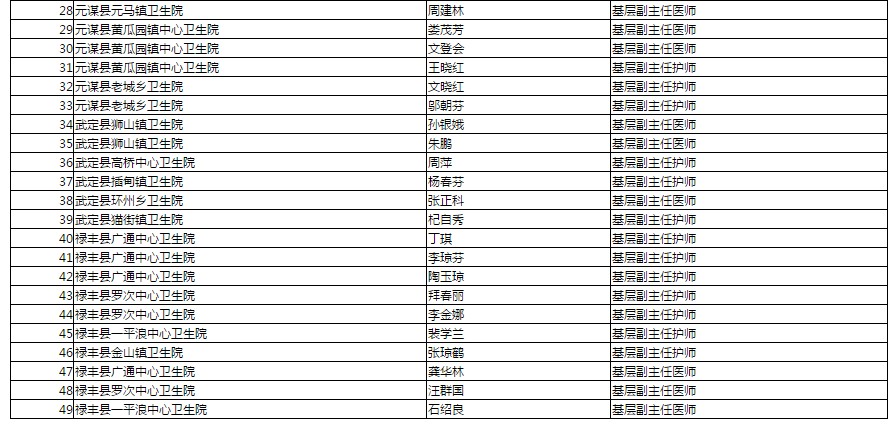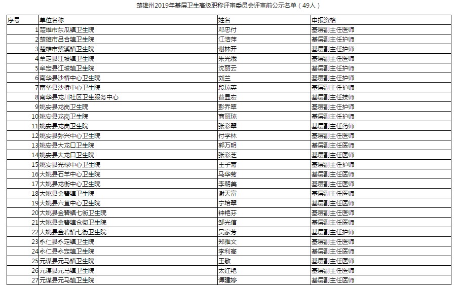 根据《云南省人力资源和社会保障厅关于印发2019年高级专业技术职称评审计划的通知》(云人社通〔2019〕47号)要求,楚雄州2019年基层卫生高级职称评审会将于9月召开。经对申报人员范围对象、程序手续、申报评审条件进行资格审查,现将拟同意提交评委会评审的49名参评人员予以公示(公示期为2019年8月29日—9月4日)。在公示期内对申报人不符合资格条件或弄虚作假的情况,可向楚雄州卫生健康委人事科或州纪委监委派驻州卫生健康委纪检监察组反映。