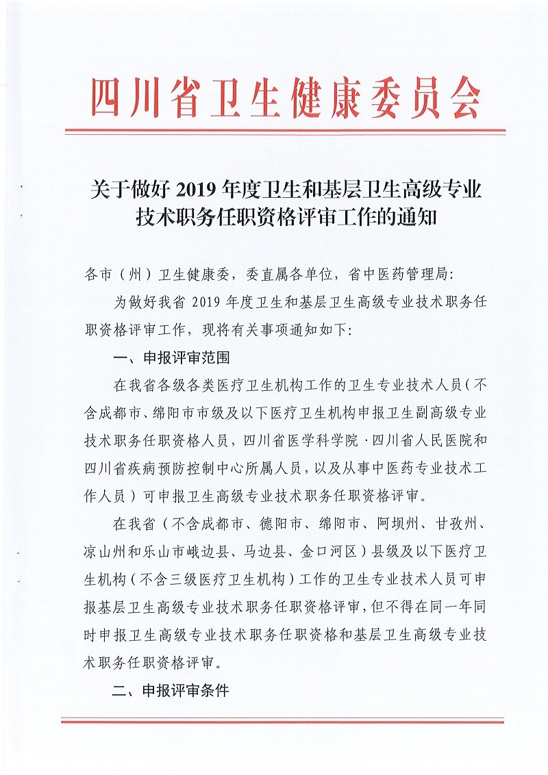 四川卫健委发布了《四川省卫生健康委员会关于做好2019年度卫生和基层卫生高级专业技术职务任职资格评审工作的通知》,医学教育网小编为各位考生整理搜集了如下内容,请注意查看: