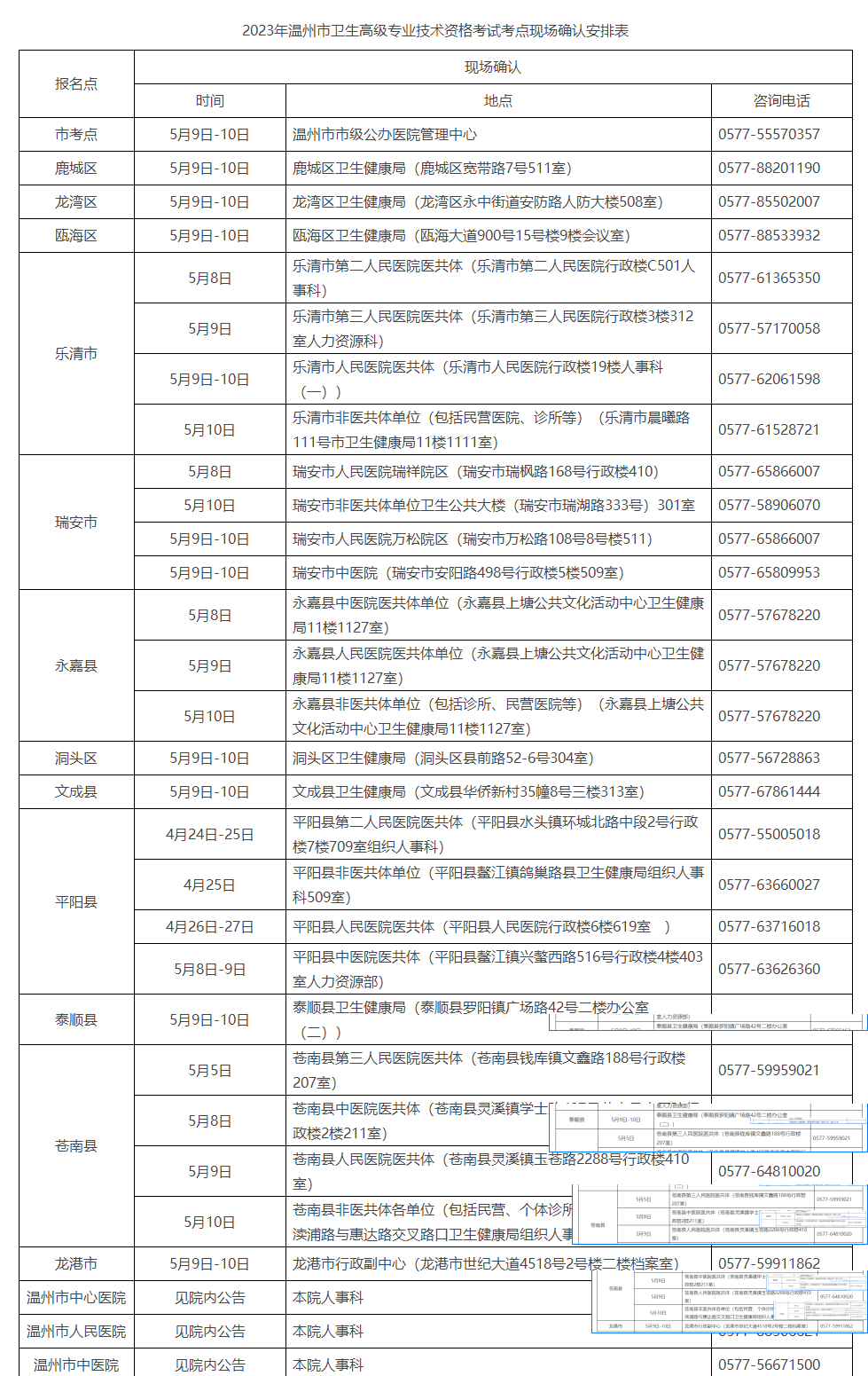 (二)现场确认。完成网上预报名者,持《2023年度卫生高级专业技术资格考试申报表》及相关证件、材料,在规定时间内到所辖报名点完成报名资格现场确认。(具体时间、地点见下表)。